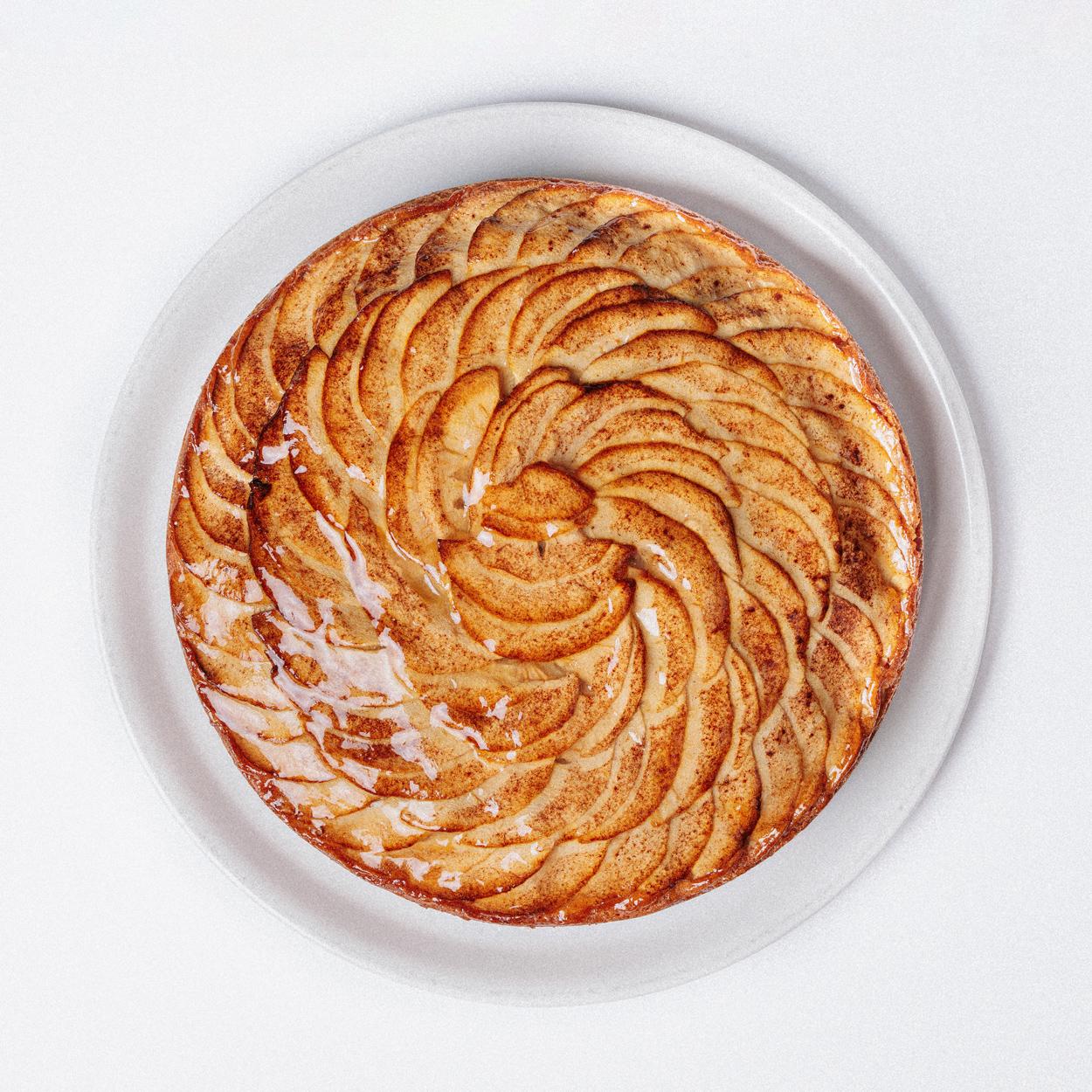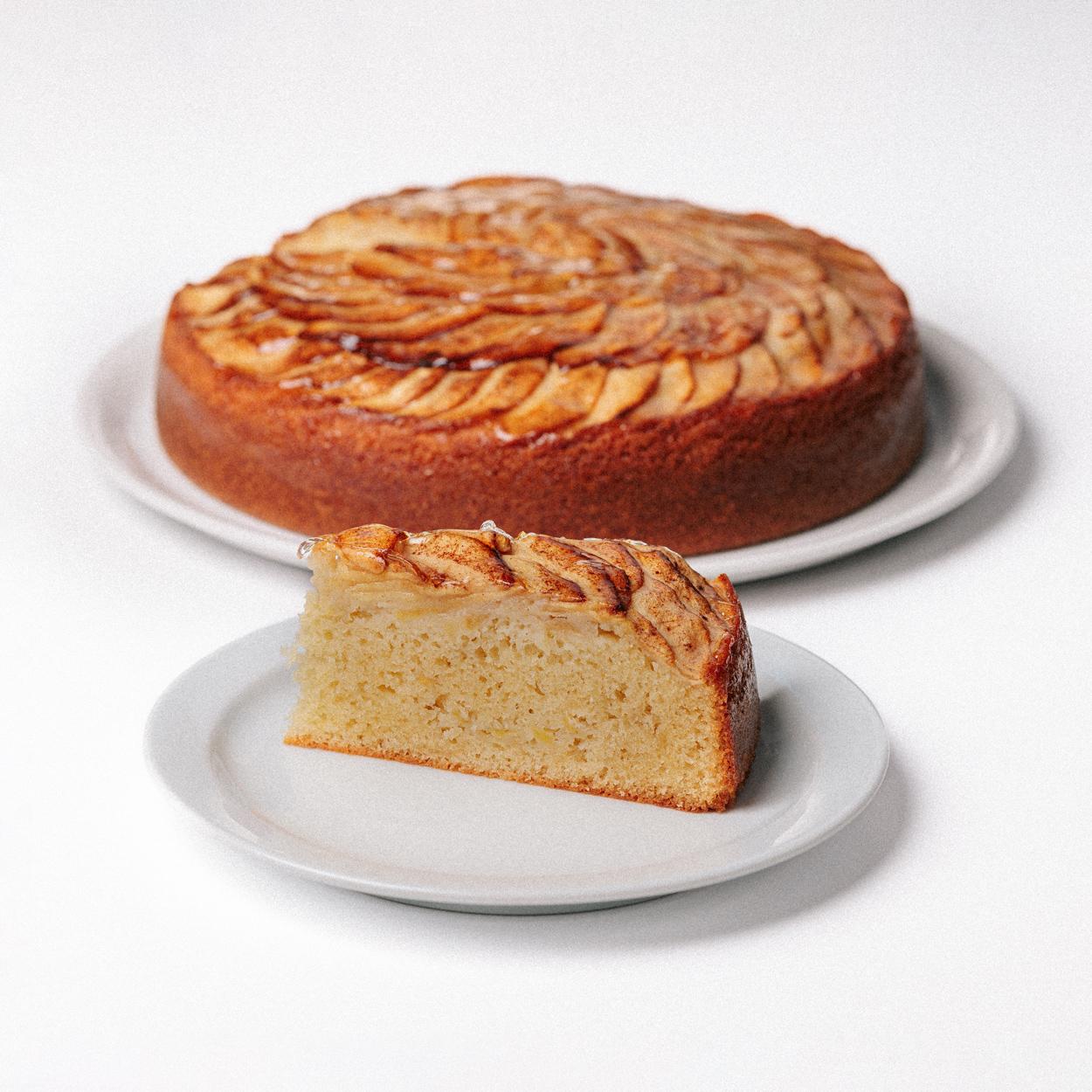Un bizcocho tierno cubierto de láminas de manzanas con más fruta en su interior, con un delicado toque de canela y ralladura de naranjas.