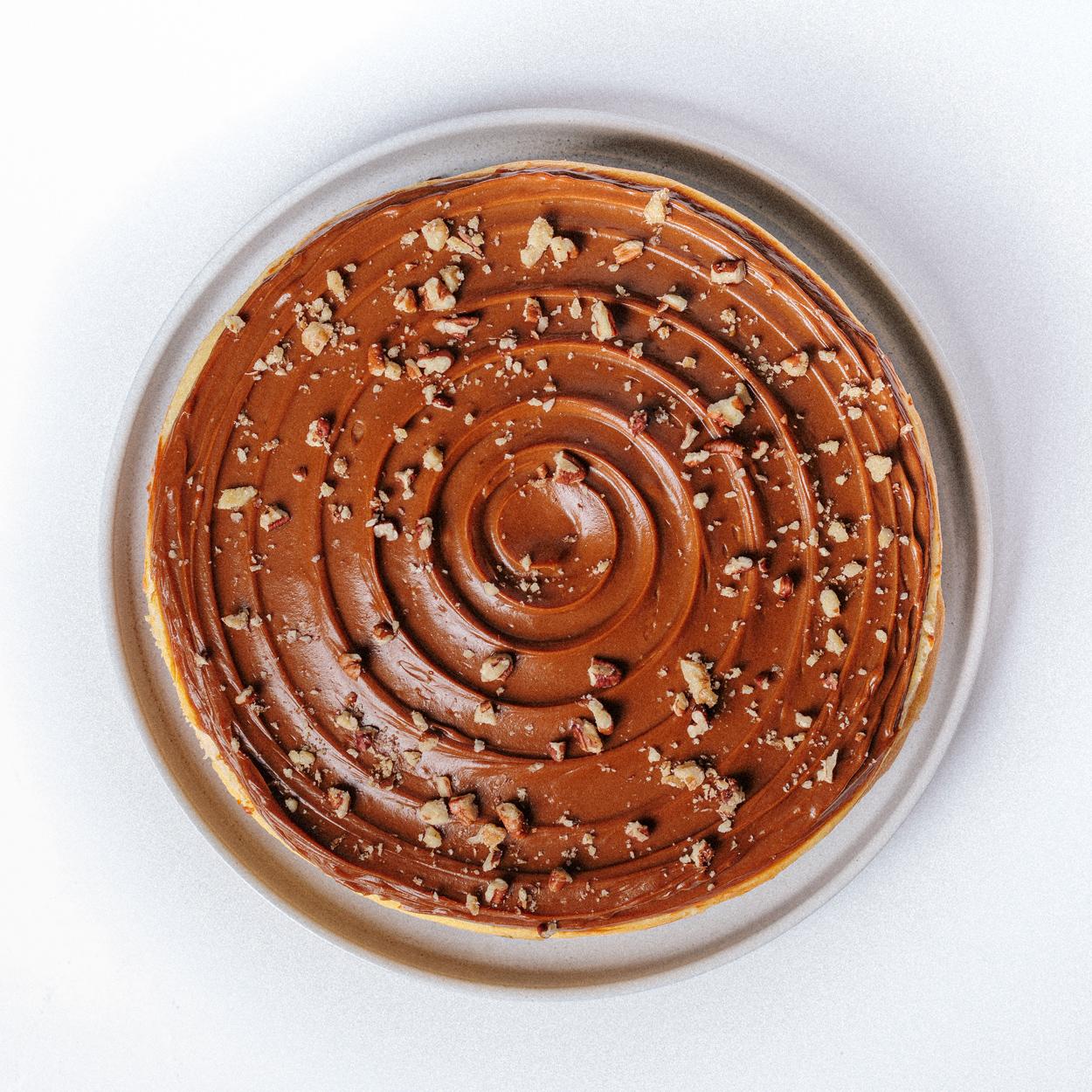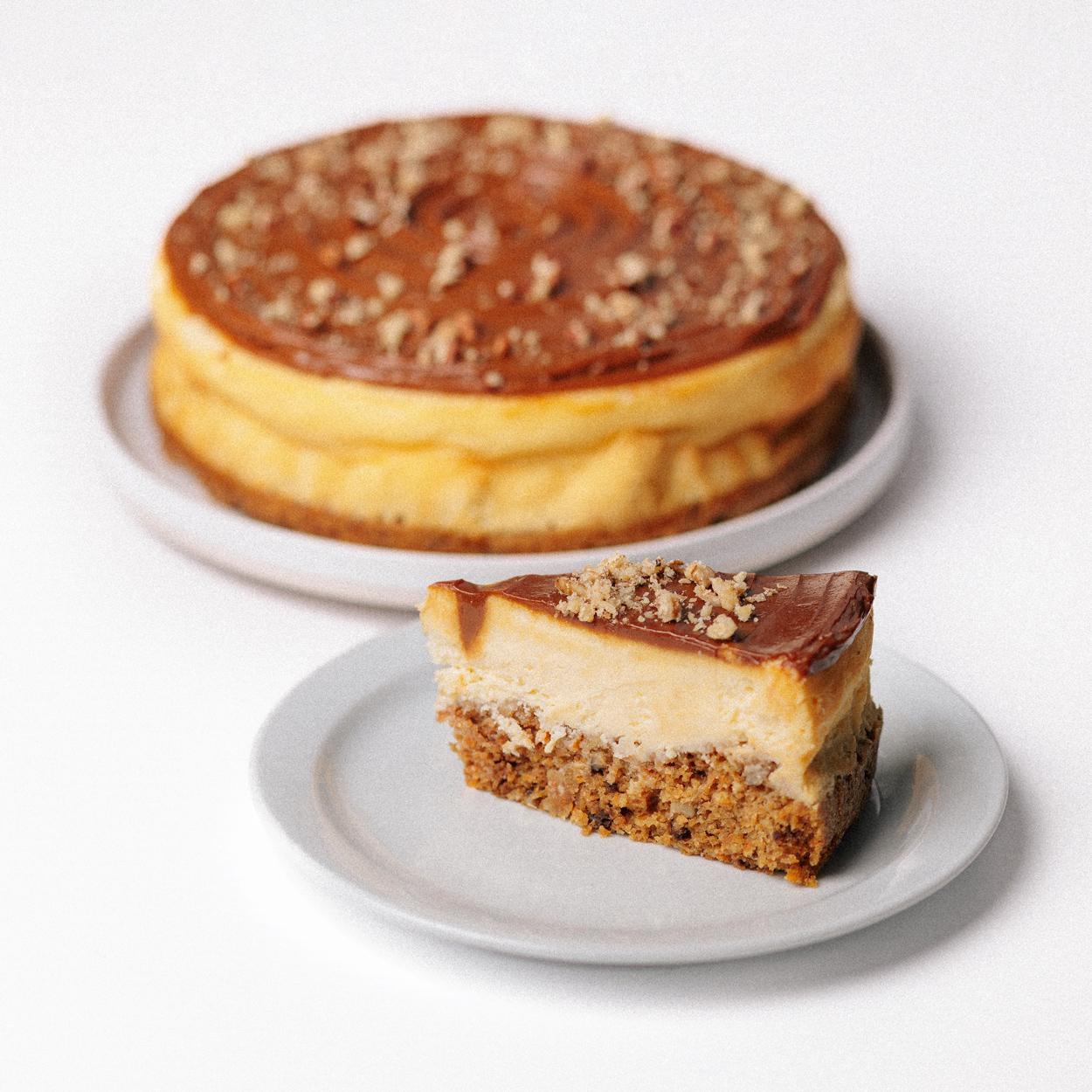 Una combinación deliciosa de nuestra clásica carrot cake y tarta de queso cheesecake cubierta con dulce de leche y nueces de California.