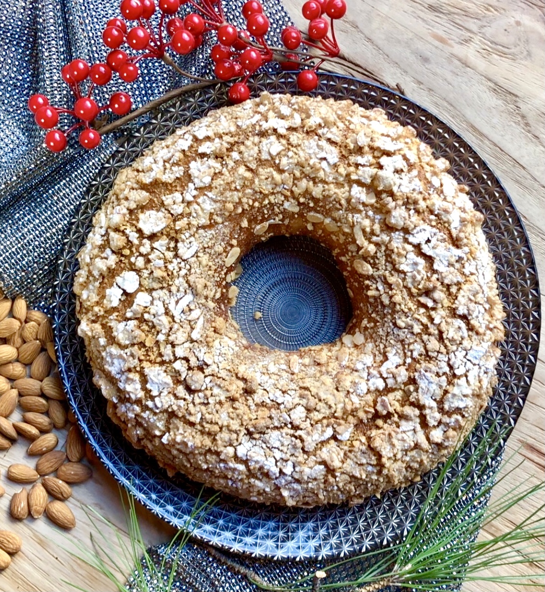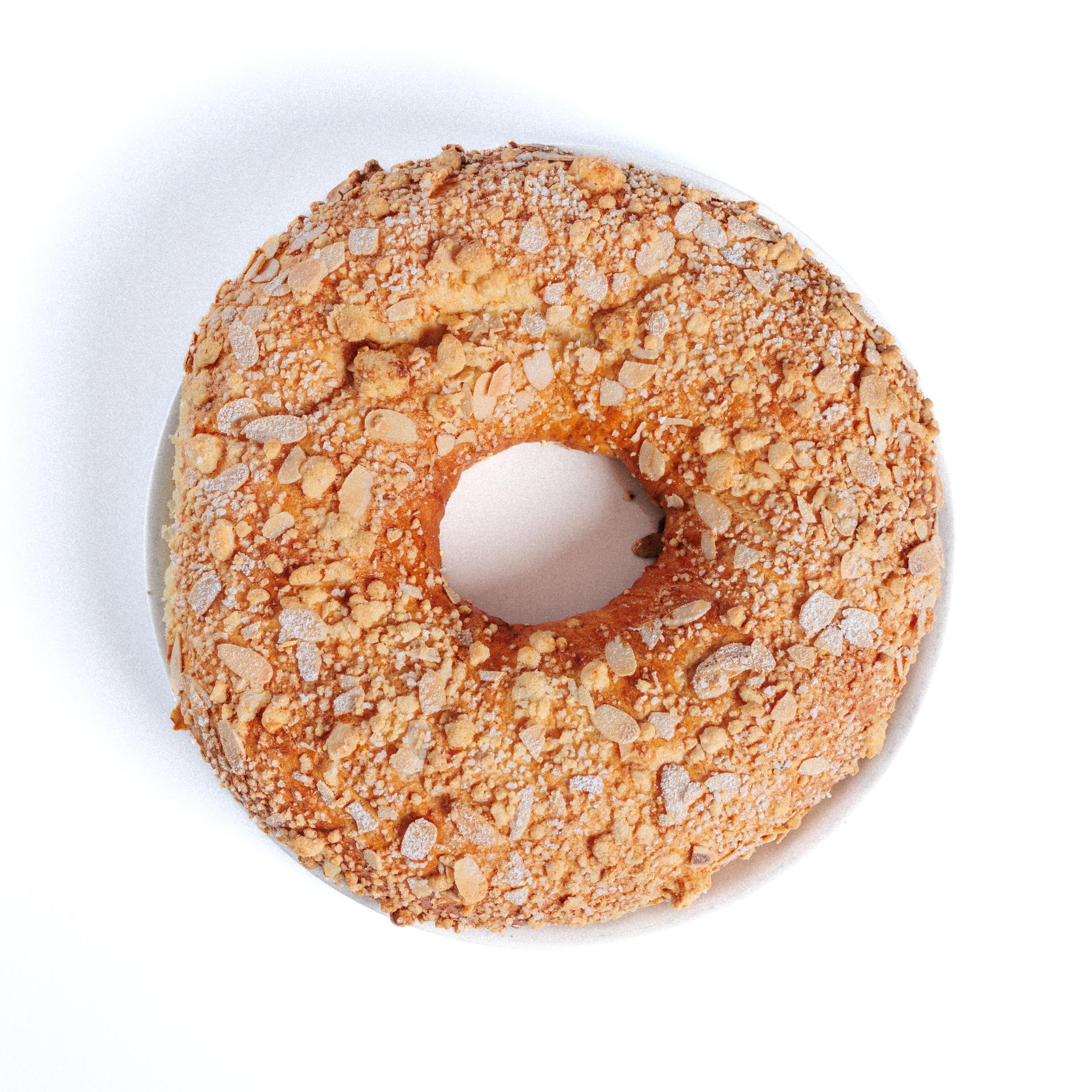 Nuestra decoración es sencilla y elegante: crumble de almendras marcona, almendras laminadas y azúcar.